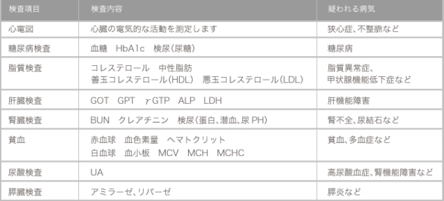 人間ドックは、全身状態の異常の有無についての概略を把握するための検査です。 主な内容は、診察・問診・身体測定・血圧測定・視力検査・聴力検査・胸部X線検査・心電図検査・採尿・採血などを行います。